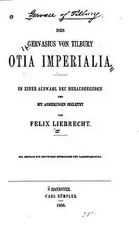 Otia Imperialia ("Recreation for an Emperor") is an early 13th-century encyclopedic work, the best known work of Gervase of Tilbury. It is an example of speculum literature. Also known as the "Book of Marvels", it primarily concerns the three fields of history, geography, and physics, but its credibility has been questioned by numerous scholars including philosopher Gottfried Leibniz, who was alerted to the fact that it contains many mythical stories. Its manner of writing is perhaps because the work was written to provide entertainment to Holy Roman Emperor Otto IV. However, many scholars consider it a very important work in that it "recognizes the correctness of the papal claims in the conflict between Church and Empire."[1] It was written between 1210 and 1214, although some give the dates as between 1209 and 1214[2] and numerous authors state it was published c.1211.[3][4]