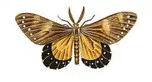 Upperside. Antennae strongly pectinated and brown. Head brown, the front being white. Thorax brown, with two white streaks along it. Abdomen brown. Wings black, streaked with light brown from the shoulders along the tendons, and two light yellowish patches, almost crossing the wings from the anterior edges, with a row of white spots placed along the external edges. Posterior wings dark yellow, with a deep black border running along the external edges from the upper to the abdominal corners.