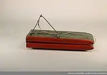 The otter may have multiple different designs. Otter boards used in bottom trawling are based on a similar principle of design. The design takes advantage of the shearing effect achieved when the board is positioned at an oblique angle to the current. The effect is reminiscent of that of a kite in the wind.[2][1] Different designs are found in Switzerland, the nordic countries, California and Japan. Most commonly the traditional board was made by wood, and had a length about two feet, a width of 6 inches and less than an inch thick. To enable it to float in an upright position it was equipped with metal weights made of lead or iron.[3] The correct amount of weights allows the board to float with only an inch or two above the surface. Snells, bated with flies or spoons are placed at intervals along the line. The snells would have different lengths due to the depth of which the line would float in the water. the longest snell would have been closest to the board, and the shortest closest to the fisherman.[3] In Britain fishing with an otter was forbidden by the Salmon Fishery Act 1861, and this may have been one of the reasons why British anglers introduced it to Norway. The first ban on the device in Norway was imposed in 1870 an it was increasingly forbidden throughout the end of the century.[3]