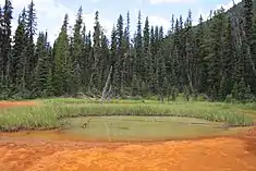 The Paint Pots are an acidic, cold water, mineral spring system from which ochre is deposited at spring outlets. The minerals are principally iron oxide which produces the water and mud's reddish colour but other similar minerals can also be present and vary the colours to include various shades of yellow, red and brown. The acidic, metal-rich water has limited capacity to support living species, but at least 14 species of algae, one liverwort and one moss species, as well as some extremophilic bacteria, have been identified living in those waters. The ochre was collected by the Ktunaxa people for use as pigments and the iron oxide was commercially mined for use in paint manufacturing for nearly two decades until the park was established in 1920.[6]