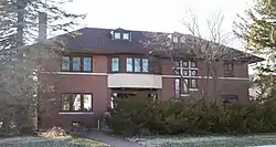The two-story, brick residence with a rubble stone foundation follows a rectangular plan. The main facade is asymmetrical. The open entry porch is off-center and features a superimposed chamfered balcony room. It is balanced by the stepped window stair set to the right. These two elements are vertically aligned with two hipped dormers on the roof. The entry is flanked by two free-standing flared columns with decorative capitals. They support an exposed wooden beam below the balcony room. Postville limestone contrasts with the red Monona brick, and was used for the water table, first floor window sills, terrace copings, a continuous projecting belt course, chimney copings, and a surround on the stair window set. The back of the house features a half-octagonal kitchen wing, which is in line with the main entrance.[2] The house was listed on the National Register of Historic Places in 1985.[1]