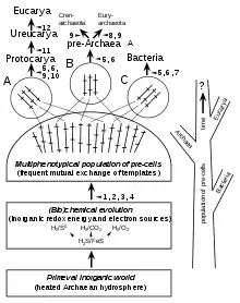 In addition, Kandler studied the early diversification of life.[40][6][41] He assumed that the early evolution of organisms did not start from a common first ancestral cell, but that each domain evolved by "multiple cellularization of a multiphenotypical population of pre-cells",[6] where the invention of cell envelopes played an important role. Kandler's contribution to our understanding of the early evolution of life was valued several times, e.g. Müller 1998,[17] Wiegel 1998,[43] Wächtershäuser 2003[44] and 2006,[45] Schleifer 2011.[3]