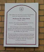 Stern completed his studies at the University of Breslau in 1912 with a doctoral dissertation in physical chemistry[1] under supervision of Otto Sackur on the kinetic theory of osmotic pressure in concentrated solutions. He then followed Albert Einstein to Charles University in Prague and in 1913 to ETH Zurich. Stern served in World War I doing meteorological work on the Russian front while still continuing his studies and in 1915 received his Habilitation at the University of Frankfurt. In 1921 he became a professor at the University of Rostock which he left in 1923 to become director of the newly founded Institut für Physikalische Chemie at the University of Hamburg.