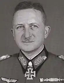 Born in Berlin in 1886 to a noble family, Knobelsdorff joined the army of Imperial Germany in 1905 as a Fahnen-junker (officer cadet) and served in the infantry.[1] Twice awarded the Iron Cross during World War I,[2] he later served in the Heer (Army) branch of the Wehrmacht. He was chief of staff of Corps Command XXXIII at the time of the outbreak of World War II. A generalmajor,[Note 1] he was given command of the 19th Infantry Division on 1 February 1940[1] and led it through the Battle of France and during subsequent occupation duty. In October, the division was withdrawn to Germany for conversion to armour. It was re-designated the 19th Panzer Division[4] and Knobelsdorff, promoted to Generalleutnant[Note 2] in late 1940, oversaw his command's transition from infantry to tanks.[1]