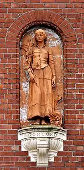 Another competition was called for in 1885, this time for just civic offices (i.e. for a council meeting venue and for staff), and on the same site as the Land Office.[3] Controversy erupted when the competition was won by Samuel Hurst Seager; he was young and relatively inexperienced, and his design in Queen Anne style was an architectural type unfamiliar to New Zealand.[2] Construction began in 1886, but the controversy continued when councillor Samuel Paull Andrews claimed the building was structurally unsound. Benjamin Mountfort and John Whitelaw, both architects, and Edward Dobson, an engineer, reviewed the design and the building and found everything to be safe. The only suggestion they made was to strengthen the roof in a different, more costly way than designed by Seager.[2] The building was completed on 24 March 1887 and council met for the first time in their new premises on 4 April 1887.[3] The south façade of the building has two terracotta sculptures by George Frampton that represent 'Industry' and 'Concord'.[2]