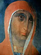 The icon is tempera on wood, 44 by 36 cm. It depicts just the head of the Virgin Mary. Her face is seen in three-quarters profile, slightly inclined towards her left shoulder. The face is oval with a long nose in the Byzantine style.
