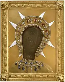 In Russia, the icon was again covered in a riza of gold and precious stones. The riza includes a horseshoe-shaped diadem with rubies and diamonds, two necklaces of sapphire and diamond, and a halo in the form of the Maltese cross, the eight points shown as protruding from behind the head of the Virgin. Tsar Nicholas I ordered a copy to be made, to be carried in processions due to the fragile state of the original. This copy is now kept in the Papal Basilica of Saint Mary of the Angels in Assisi.