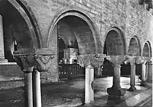 On the left side of the presbytery there is a loggia rebuilt in recent times by reusing columns and capitals originally used in an ancient cloister that no longer exists. The capitals, each one different from the others, are carved with different themes, such as animals, leaves, lions and horned anthropomorphic heads.[6]