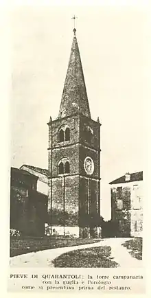 Already existing in the 9th century during the feud of Ugo di Maginfredo, the presence of the parish church is attested in a historical document of 1044, which mentions the important cultural and religious nucleus of Quarantoli, like the abbey of Nonantola. The church was completely rebuilt in the 12th century by Matilde di Canossa.[1]