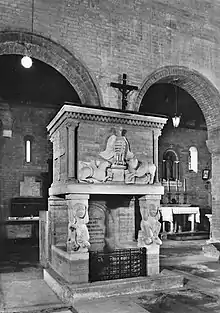 The altar is made of a pair of elegant late-Romanesque pillars of the Modena school, one surmounted by a sculpted cubic capital with sloping foliage and the other sculpted in a bundle of knotted columns with a volute capital, supporting the mensa.[7]