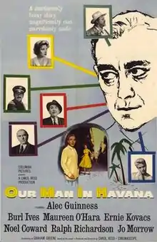 Our Man in Havana is a 1959 British spy comedy film shot in CinemaScope, directed and produced by Carol Reed, and starring Alec Guinness, Burl Ives, Maureen O'Hara, Ralph Richardson, Noël Coward and Ernie Kovacs.[2][3][4] The film is adapted from the 1958 novel Our Man in Havana by Graham Greene. The film takes the action of the novel and gives it a more comedic touch. The movie marks Reed's third collaboration with Greene.
