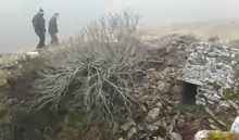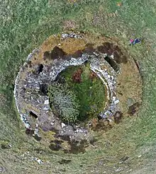 A human skeleton was discovered buried face-down by the entrance to the stairs.[1] These were dated to the post-Medieval period when examined in 1891, but with the remains now lost, any reassessment of their age cannot be undertaken.[1] The individual perhaps represents a deviant burial (a culturally atypical burial, often afforded to those excluded from society) or was the victim of a more recent attack, such as the clan feuds of the previous centuries.[1] Deviant burials are known from a wide variety of prehistoric and historical periods, including the Iron Age, so its association with the primary phase of use of the broch is not impossible.[7]