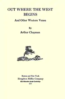 "Out Where the West Begins" is a poem written by Arthur Chapman and first published in his 1917 book of verse, Out Where the West Begins: And Other Western Verses. It is his most popular poem, still included in modern readings and compilations of Cowboy and Western poetry. The poem itself is about the wonders of nature, and is designed to create feelings of peace.