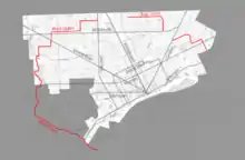 At its western starting point at Jefferson Avenue in Ecorse near the Detroit River, the thoroughfare meanders northwesterly to Michigan Avenue, where it makes a northeast bend along the River Rouge; it then continues northeasterly with several 90 degree angle turns until Outer Drive ends at Livernois Avenue. Outer Drive then resumes on Detroit's east side, over-taking State Fair Avenue, Conner Avenue, Alter Road, Chandler Park Drive, and Whittier Avenue, with its eastern terminus at Mack Avenue at the northern edge of the City of Grosse Pointe Park, but not actually entering that city. Outer Drive is notable for having several isolated divided portions. There are three such segments. The largest is the westernmost section, beginning at Jefferson Avenue in Ecorse and ending at Livernois Avenue in Detroit—this particular sector is 23.6 miles (38.0 km).[1] The middle section is between Dequindre Road (at East State Fair Avenue) and at East McNichols Road (between the Mount Olivet Cemetery and the Coleman A. Young International Airport); that section is 4.9 miles (7.9 km) entirely within Detroit.[2] The easternmost section is between Conner Avenue (near Gratiot Avenue) and Mack Avenue; this portion is 5.3 miles (8.5 km) and likewise completely inside Detroit.[3]