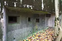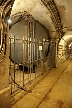 Fermont comprises two entrance blocks, three infantry blocks, three artillery blocks, and one observation block. The combat blocks are connected to the entries and support areas by a gallery system extending over 1,000 metres (3,300 ft) from end to end.[3] The munitions and personnel entries are located far to the rear of the compactly arranged combat blocks, with the entries hidden in the woods. Both entry blocks required elevators to reach the level of the gallery, as the preferred inclined or level tunnel could not be achieved in the local topography.[4] A partial "M1" ammunition magazine is located just inside the ammunition entry, while the underground barracks are located near the junction of the two entry galleries. From there a long, straight gallery runs at an average depth of 30 metres (98 ft) to the combat blocks. Fermont was served by a 60 cm-gauge narrow-gauge railway, which enters at the munitions entrance and runs all the way out through the galleries to the combat blocks. On the surface, the railway connects to supply points to the rear and to other ouvrages.