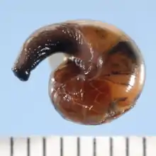 ![]() Umbilical view of a preserved specimen of Ovachlamys fulgens. The scale bar is in mm. |