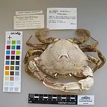 Ovalipes catharus, commonly known as paddle crab and Māori: pāpaka,[2] is a species of crab of the family Portunidae. It is found around the coasts of New Zealand, the Chatham Islands, and in south-eastern parts of Australia.[3] Individuals from shallow waters, 0.1–0.5 metres (4–20 in) deep, have a carapace width of only 10–15 millimetres (0.4–0.6 in), while those from 5–15 m (16–49 ft) are 100–140 mm (3.9–5.5 in) wide.[4]