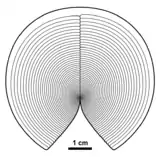 This fossil has the form of a rounded shield, enclosing strongly concentric corrugations or ribs, which weaken adjacent to a triangular neckline. A suture-like zone extends through the center from the apex of the neckline towards the opposite margin. The ribs become wider towards the periphery.[1][2]
