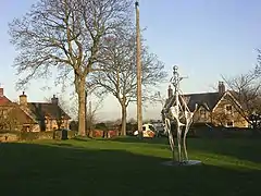 One of Ovington's distinguishable landmarks is a 60 ft high maypole situated on the village green and an integral part of the village's annual May Day celebrations. The original maypole was erected in 1897 to commemorate the diamond jubilee of Queen Victoria, it became a grade II listed structure in 1987,[4] in 2006 the pole was replaced after costs to maintain the original structure had become too high,[5] in November 2015, high winds caused the maypole to snap[6] however by September 2016 it had been replaced, and sections of the former maypole were crafted into benches on the green.[7]