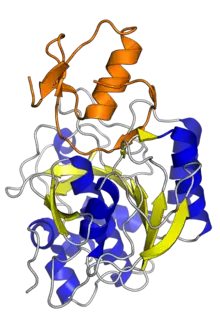 ![]() The third Kazal domain of the turkey ovomucoid protein (orange) bound to subtilisin Carlsberg, a serine protease.[1] | |||||||