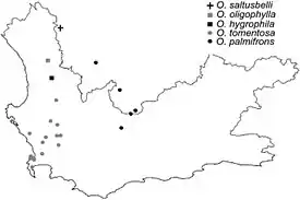 Geographic distribution of species in Oxalis tomentosa alliance, including O. palmifrons. Border depicts Western Cape region of South Africa.