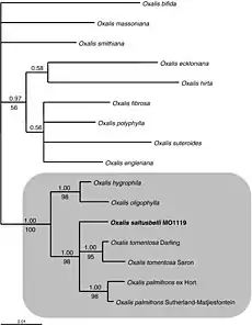 The species is a member of the Oxalis tomentosa alliance, which includes O. oligophylla Salter, O. hygrophila Dreyer, O. tomentosa L., O. palmifrons Salter, and O. saltusbelli.[3]