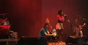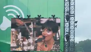 Lily Allen altered lyrics to one of her songs due to having a young Irish cousin in the audience.[98] She had flown in from Belgrade and her performance included a cover version of "Womanizer" by Britney Spears and "Fuck You", her ode to George W. Bush, which had the crowd raising their middle fingers during the chorus.[105][108] She also performed her cover version of the Kaiser Chiefs song "Oh My God" but bemoaned the crowd's reaction to some of her songs, yelling: "Oh, you guys are like women. C'mon you lot!"[106] She later wandered around talking to fans alongside two bodyguards.[105]