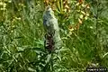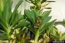 The larvae feed on Euphorbia species, with a preference for species in the subgenus Esula. They feed in silken webs on the apices of their host plant, causing extensive damage. First instars larvae feed on flower buds and tender leaves in groups of 20-30. Fifth and final instar larvae are solitary feeders and consume less than the other instars. Pupation takes place in a light yellow silk cocoon spun on the stem of the host plant.