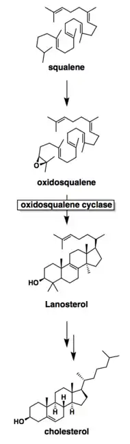 High blood cholesterol, also called hypercholesterolemia, significantly increases the risk of stroke, heart attack, and peripheral artery disease. If untreated, it can also lead to plaque accumulation in blood vessels, which is known as atherosclerosis.[13] For this reason, the sterol biosynthetic pathway has long been a target for the drug development industry. Statins, which inhibit HMG-CoA reductase (an enzyme that catalyzes an earlier step in the cholesterol biosynthesis pathway) are commonly prescribed to treat high cholesterol. Research is being done for other compounds which block different steps in the biosynthesis of cholesterol, including the reaction performed by oxidosqualene cyclase which cyclizes squalene to form lanosterol.[14]