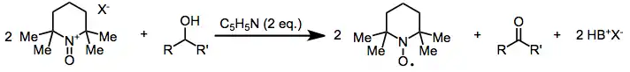 Under neutral or slightly acidic conditions (in the presence of silica gel, for instance), oxidation occurs by an initial hydrogen bond between the hydroxyl group and the oxoammonium nitrogen, followed by concerted proton transfer and hydride abstraction.[5] The need for hydrogen bonding is supported by the low reactivity of β-alkoxy and β-amino alcohols, which exhibit competitive intramolecular hydrogen bonding. The mechanism of oxidation under weakly basic (pyridine) conditions is similar, except that pyridine neutralizes the hydroxyammonium species, and this intermediate "comproportionates" with oxoammonium salt to give nitroxide radicals and pyridinium salts (see equation (3) below). Because this reaction consumes base and active oxidant, two equivalents of base and oxidant are necessary under weakly basic conditions. A unified mechanism under neutral and basic conditions in presented in a recent article.[6] The authors present a comprehensive analysis of a number of oxoammonium salt mediated oxidations.