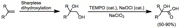 The use of chlorites as terminal oxidants in conjunction with both hypochlorites and TEMPO gives carboxylic acids without chlorination side products.[15] The reaction is usually carried out in two steps in the same pot: partial oxidation is effected with TEMPO and hypochlorite, then chlorite is added to complete the oxidation. Only primary alcohol oxidation is observed. In conjunction with Sharpless dihydroxylation, this method can be used to generate enantiopure α-hydroxy acids.[16]