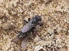 | Oxybelus bipunctatus carrying fly prey to be buried | |