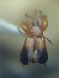 More characteristic are the larvae. Their labrum has two sensilla at the base and two more towards the center of the forward maring. They have a typical body shape with recurved hindparts; the anus opens on the underside. Except in Oxycraspedus, the dark forehead is bordered by a ridge towards the back, where the cuticle attaches, and the body is widest in the middle of the abdomen. And of course, Oxycorynini larvae differ from other belids in that their larvae do not feed on dead or decaying wood but on flowers and fruits.[1]