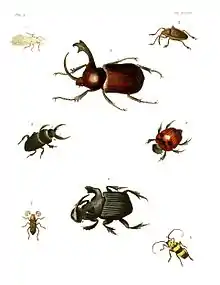 Oxysternon festivum was among the first dung beetle species studied by zoologist in the early 18th century. The first illustration of an "exceedingly beautiful shining gold and red, three horned beetle" was published in 1747 by August Johann Rösel von Rosenhof, and a first description was done by Laurens Theodorus Gronovius in 1764, but the names applied were non-binomial and therefore invalid for nomenclatural purposes.[3][4][5] It was later re-described by Carl Linnaeus under the name of Scarabaeus festivus, and was subsequently included in most publications regarding exotic insects in the late 18th and early 19th centuries.[6][7][8][9][10]