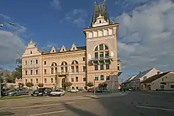 The former Civil Savings Bank is a Neo-Renaissance building from 1899–1901 and the Neo-Renaissance building of the elementary school from 1880–1881 are landmarks of the town square and whole town.[2][8]
