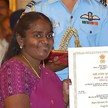 On International Woman's Day in 2015 she received the Nari Shakti Puraskar.[3] She was one of the first eight Nari Shakti Awards for her leadership and achievement the year before.[6] The award was made on International Women's Day from the then Indian President Pranab Mukherjee.[7]