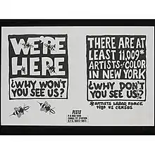 While the members of PESTS are not known, members of the Guerilla Girls have stated that a Black member of Guerrilla Girls founded PESTS.[2] PESTS also used similar tactics, including highlighting statistical data on posters with text graphics. Posters and flyers produced by PESTS included statements such as "THERE ARE AT LEAST 11,009* ARTISTS OF COLOR IN NEW YORK ¿WHY WON'T YOU SEE US?" and "¿WHAT IS TOKENISM (ANSWER) WHEN YOU'VE SEEN ONE ARTIST OF COLOR BUT THINK YOU'VE SEEN TEN."[3] Artist Howardena Pindell, who has highlighted systemic racism in the art world in her personal scholarship and activism,[4] has said that she participated in PESTS.[3]