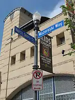Statues of Pirates' Hall of Famers Honus Wagner, Roberto Clemente, Willie Stargell and Bill Mazeroski are positioned at various points outside of PNC Park. Wagner and Clemente's statues were previously located outside of Three Rivers Stadium, and after the venue was imploded, the two statues were removed from their locations, refurbished, and relocated outside PNC Park.[42] Wagner's statue was originally unveiled at Forbes Field in 1955.[43][44] The base of Clemente's statue is shaped like a baseball diamond, with dirt from three of the fields Clemente played at—Santurce Field in Carolina, Puerto Rico, Forbes Field, and Three Rivers Stadium—at each base.[45] On October 1, 2000, after the final game at Three Rivers Stadium, Stargell threw out the ceremonial last pitch. He was presented with a model of a statue that was to be erected in his honor outside of PNC Park.[46] The statue was officially unveiled on April 7, 2001; however, Stargell did not attend due to health problems and died of a stroke two days later.[47][48] A statue for Bill Mazeroski was added at the right field entrance, at the south end of Mazeroski Way, during the 2010 season. This was the 50th anniversary of the Pirates' 1960 World Series championship, which Mazeroski clinched with a Game 7 walk-off home run at Forbes Field. The statue itself was designed based on that event.[49]