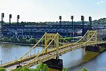 On September 5, 1991, Pittsburgh mayor Sophie Masloff proposed a new 44,000-seat stadium for the Pittsburgh Pirates on the city's North Side.[17] Three Rivers Stadium, the Pirates' and Steelers' home at the time, had been designed for functionality rather than "architecture and aesthetics".[17] The location of Three Rivers Stadium came to be criticized for being in a hard-to-access portion of the city, where traffic congestion occurred before and after games.[18] Discussions about a new ballpark took place, but were never seriously considered until entrepreneur Kevin McClatchy purchased the team in February 1996. Until McClatchy's purchase, plans about the team remaining in Pittsburgh were uncertain.[17] In 1996, Masloff's successor, Tom Murphy, created the "Forbes Field II Task Force". Made up of 29 political and business leaders, the team studied the challenges of constructing a new ballpark. Their final report, published on June 26, 1996, evaluated 13 possible locations. The "North Side site" was recommended due to its affordable cost, potential to develop the surrounding area, and opportunity to incorporate the city skyline into the stadium's design.[17] The site selected for the ballpark is just upriver from the site of early Pirates home field Exposition Park.[19][20]