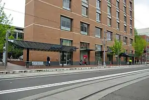 The PSU Urban Center stations are light rail stations on the MAX Green, Orange and Yellow Lines in downtown Portland, Oregon, United States, located adjacent to the PSU Urban Center, of Portland State University. The northbound platform is the PSU Urban Center/Southwest 6th & Montgomery station, and the southbound platform is the PSU Urban Center/Southwest 5th & Mill station. The stations opened on August 30, 2009, and for the next three years they were temporarily the southern passenger terminus of the Portland Transit Mall MAX extension, awaiting construction of the PSU South stations. The latter opened on September 2, 2012,[1] and the change made PSU Urban Center the second stop northbound and the next-to-last stop southbound on the Portland Mall MAX lines.