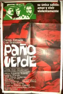 Paño verde (Green Cloth) is a 1973 Argentine gangster film drama directed by Mario David. The film, based on a 1955 novel of the same name by Roger Plá, is set in Buenos Aires in the 1940s, covering the formation, rise and fall of a criminal gang. It stars Carlos Estrada as the protagonist mafia boss Miguel Acuña, Luis Brandoni, Julia von Grolman and Héctor Alterio. Víctor Proncet composed the soundtrack.[1]
