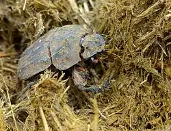It is the largest flying, ball-rolling dung beetle in the world. The front legs, that it walks on while rolling the dung ball, are particularly strong. It specializes to some extent on buffalo and elephant dung and constructs a large ball, with the flattened leg appendages. The front legs have a rufous velvet patch each, that are used to wipe the eyes clean. The eyes are oriented to provide a good downward view while flying. The dung ball is rolled away from their con-specific competitors and buried in the ground. The male forms the dung ball for breeding, and a female will approach and assist in rolling a dung ball which is to her liking.[4]