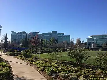 The property that Pacific Shores Center was developed on had many uses through the years from part of the Redwood City Harbor Company to cement production to being part of saltworks with Leslie Salt.[1] In 1990 the Teachers' Retirement System of the State of Illinois bought 116 acres (47 ha) of land adjacent to the Port of Redwood City and Westpoint Slough and formed the Pacific Shores Center Partnership to develop it.[2][3] After many years of planning Redwood City and the partnership had a complete development agreement with plans for a land swap, that decreased the total property to 106 acres (43 ha), and public shore space to allow for public use of parts of the property.[4] In November 1999 Jay Paul Company entered into an agreement to buy the rights for the project by outbidding several other competing developers with a US$90,000,000 bid.[5] By early 2000 with the buildings not even complete; Excite@Home, Phone.com, Informatica Corp, and BroadVision Inc. had all signed leases. Demand at the time caused rent prices to increase for the center as well.[6] At this time there were plans for a ferry service to connect San Francisco and Alameda, California to an adjacent ferry terminal to mitigate traffic concerns at the time with so many of the expected workers to be projected commuting.[7]