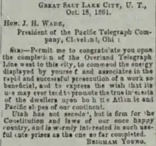 The Pacific Telegraph Company's line was completed to Salt Lake City on October 17, 1861, and the first messages were sent the following day, October 18. Brigham Young, President of The Church of Jesus Christ of Latter-day Saints, sent the first message to company president Jeptha H. Wade, congratulating him on the completion of the work. Afterwards, Frank Fuller, acting governor of Utah Territory, sent a telegram to President Abraham Lincoln saying the citizens of the territory were loyal to the United States.[8]