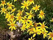 The inflorescence bears a single flower head or a cluster of a few heads and may be nearly hairless to quite woolly. The flower head contains up to 40 yellow disc florets, and usually either 8 or 13 yellow ray florets, though these are sometimes absent. It blooms in July to August.[1]: 219–220