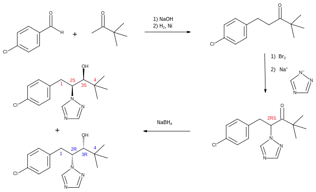 4-Chlorobenzaldehyde and pinacolone are combined in an aldol condensation to form a chalcone which is hydrogenated using Raney nickel as catalyst to give a substituted ketone. This material is brominated and the resulting compound treated with the sodium salt of 1,2,4-triazole in a nucleophilic substitution reaction. The final reduction reaction uses sodium borohydride, which in cold methanol gives almost exclusively the diastereomer pair having the absolute configuration (2R,3R) and its enantiomer (2S,3S), with only about 2% of the alternative (2R,3S) and (2S,3R) isomers. However, this pair of isomers can be produced when the reduction is carried out using butylmagnesium bromide.[5]