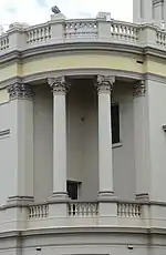 The Paddington Town Hall is two storeys, built of brick and finished with render. The overall architectural style is Victorian Free Classical.[9] The principle decorative elements are "an open colonnade to Oxford Street and rows of Roman-arched first-floor windows flanked by Corinthian pilasters and a balustered parapet".[2][10]