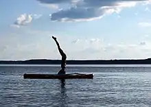Paddleboard Yoga, invented by 2009,[1] is the practice of modern yoga as exercise, and sometimes specific transitions between postures, while stand up paddleboarding, usually with the board in calm water, such as a lake.[2][3] Beginners may practice this yoga hybrid on the beach or in a swimming pool to gain the strength and flexibility to maintain the balance necessary when the board is afloat. Beginners may practice a sequence of asanas either on a normal length surfboard or a specially designed stand up paddle board; some, described as "forgiving", are inflatable.[4][5] Paddle board yoga is celebrated at the Wanderlust Festival in Hawaii.[6] One of the pioneers of Paddleboard Yoga, Rachel Bråthén, lives and teaches yoga in the island of Aruba in the Caribbean Sea; she began teaching Paddleboard Yoga in 2009.[1][7][8]