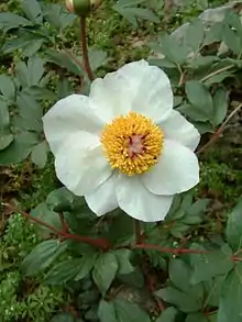 Paeonia clusii is a relatively low (25–50 cm) species of herbaceous peony with scented, white or pink flowers of up to 12 cm in diameter. In the wild, the species can only be found on the islands of Crete and Karpathos (subsp. clusii), and Rhodes (subsp. rhodia). It has pinkish-purple stem up to 30 cm long and glaucous dissected leaves. P. clusii blooms in mid-spring.[2]