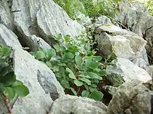 With its hairless leaves, P. daurica, does not seem te be adapted to a typical Mediterranean climate, but to rather more humid circumstances in summer. The population on Mount Orjen grows in forest consisting of silver fir, European beech, Turkish hazel, the maple species Acer pseudoplatanus and A. intermedium, and ash, and is further accompanied by widespread species such as European spindle, mountain cherry, drooping bittercress, Turk's cap lily, but also with endemics such as the Orjen iris.[6]